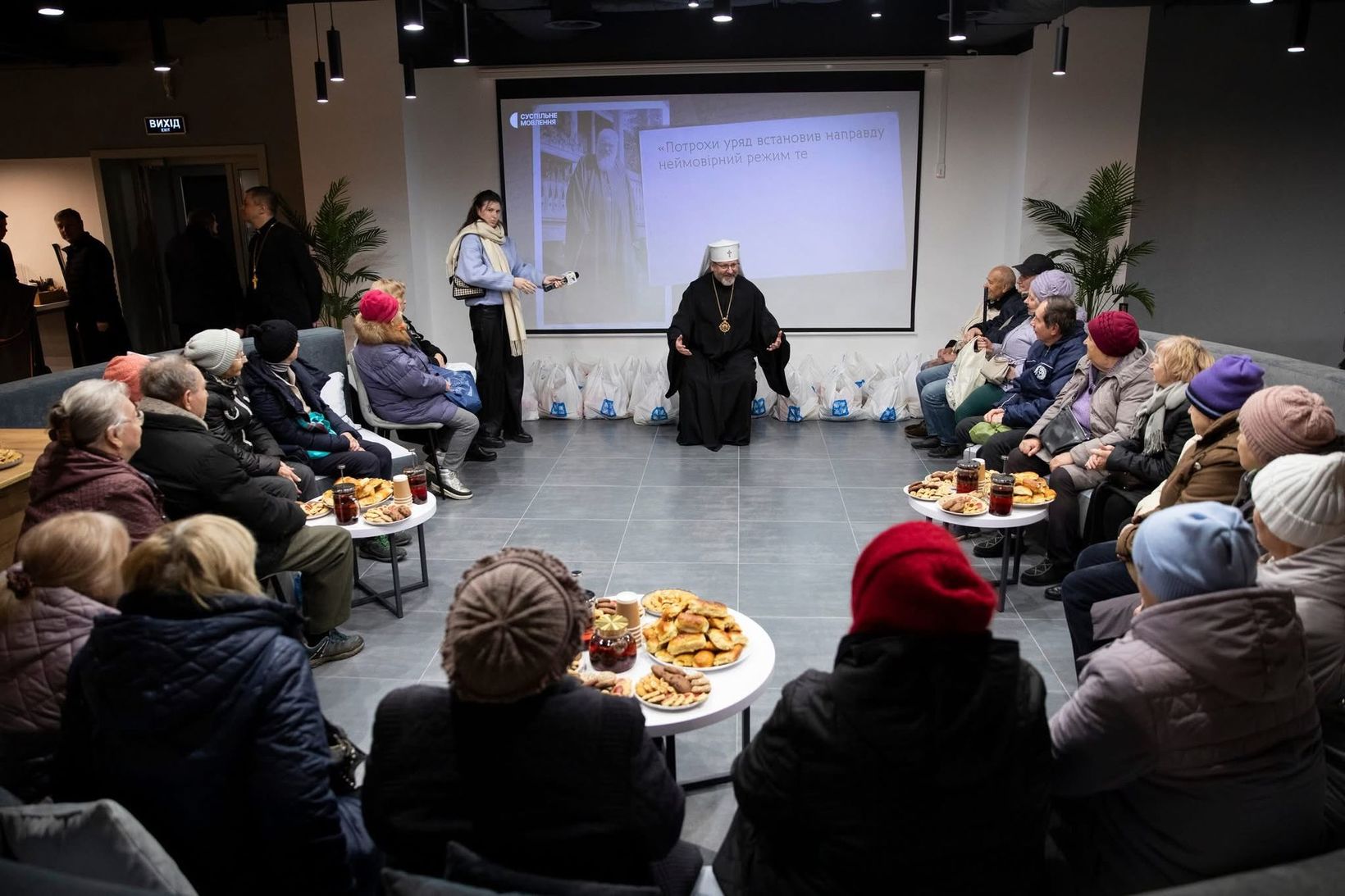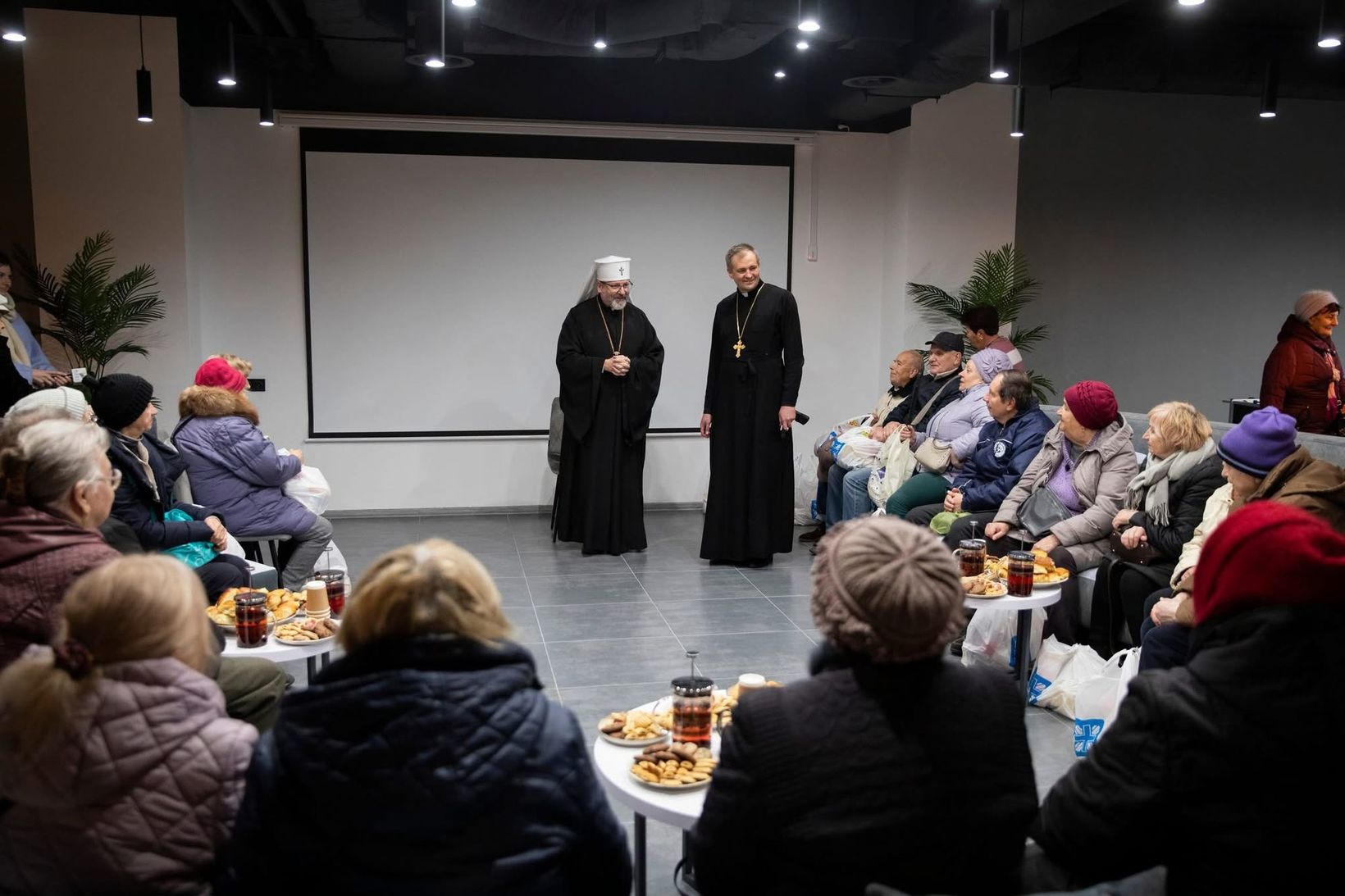 Зустріч відбулася у Соборовій світлиці, під час якої Блаженніший Святослав звернувся до присутніх зі словом підтримки й надії. Він наголосив на тому, що Церква постійно молиться за кожного, хто переживає життєві труднощі та шукає духовної й матеріальної опори. На завершення Патріарх уділив присутнім благословення і передав продуктові набори, надані Благодійним фондом «Карітас-Київ».